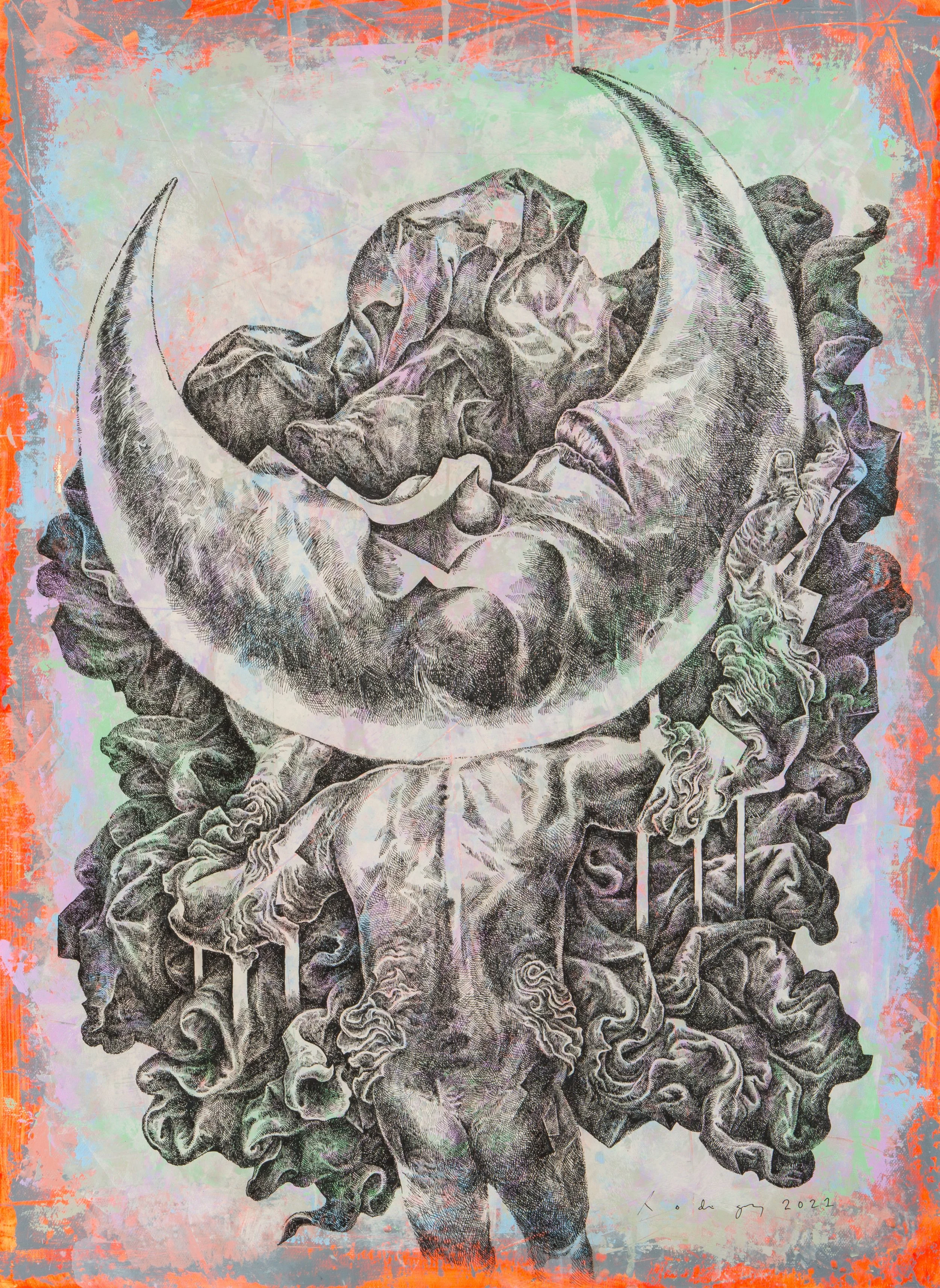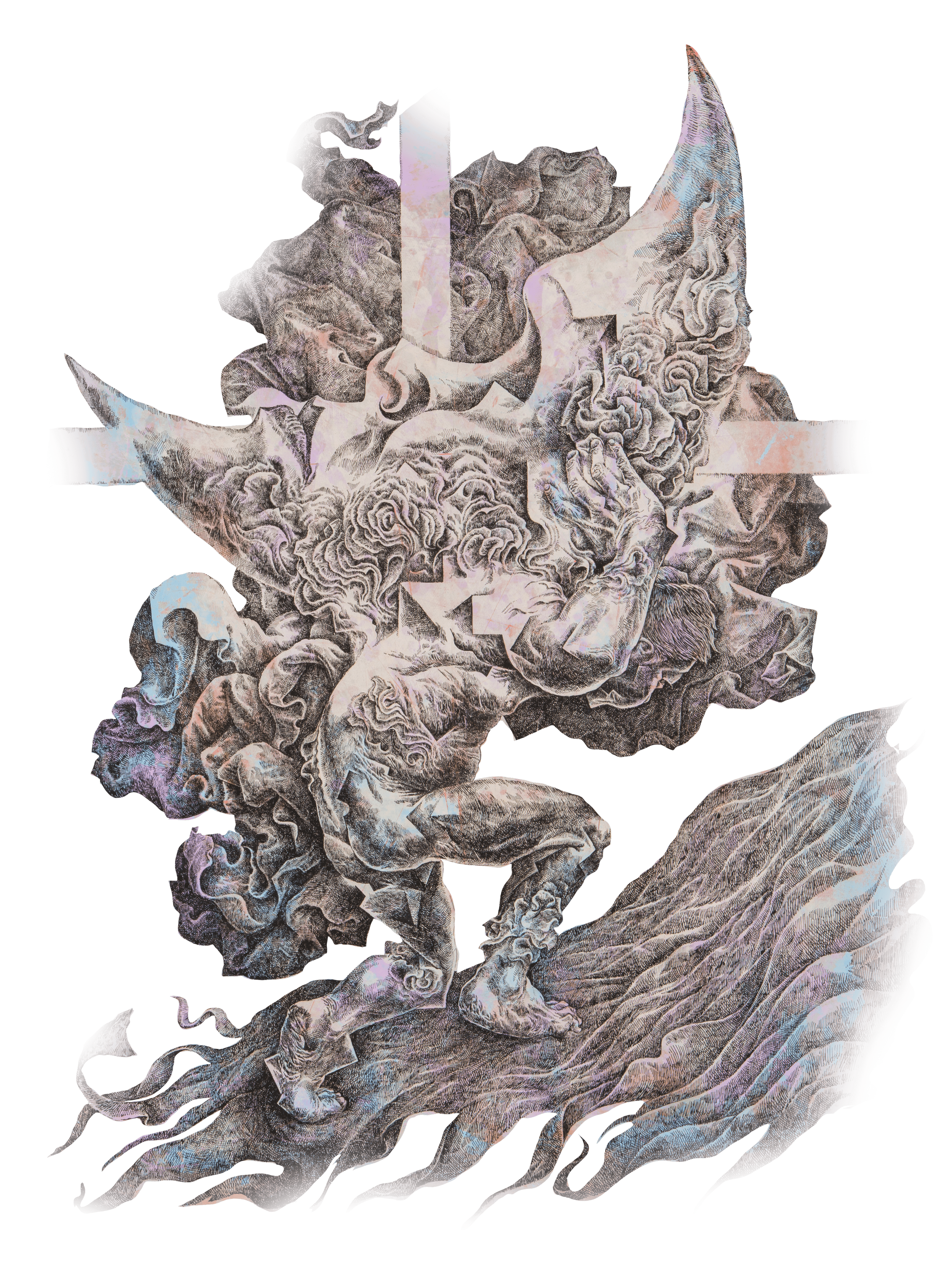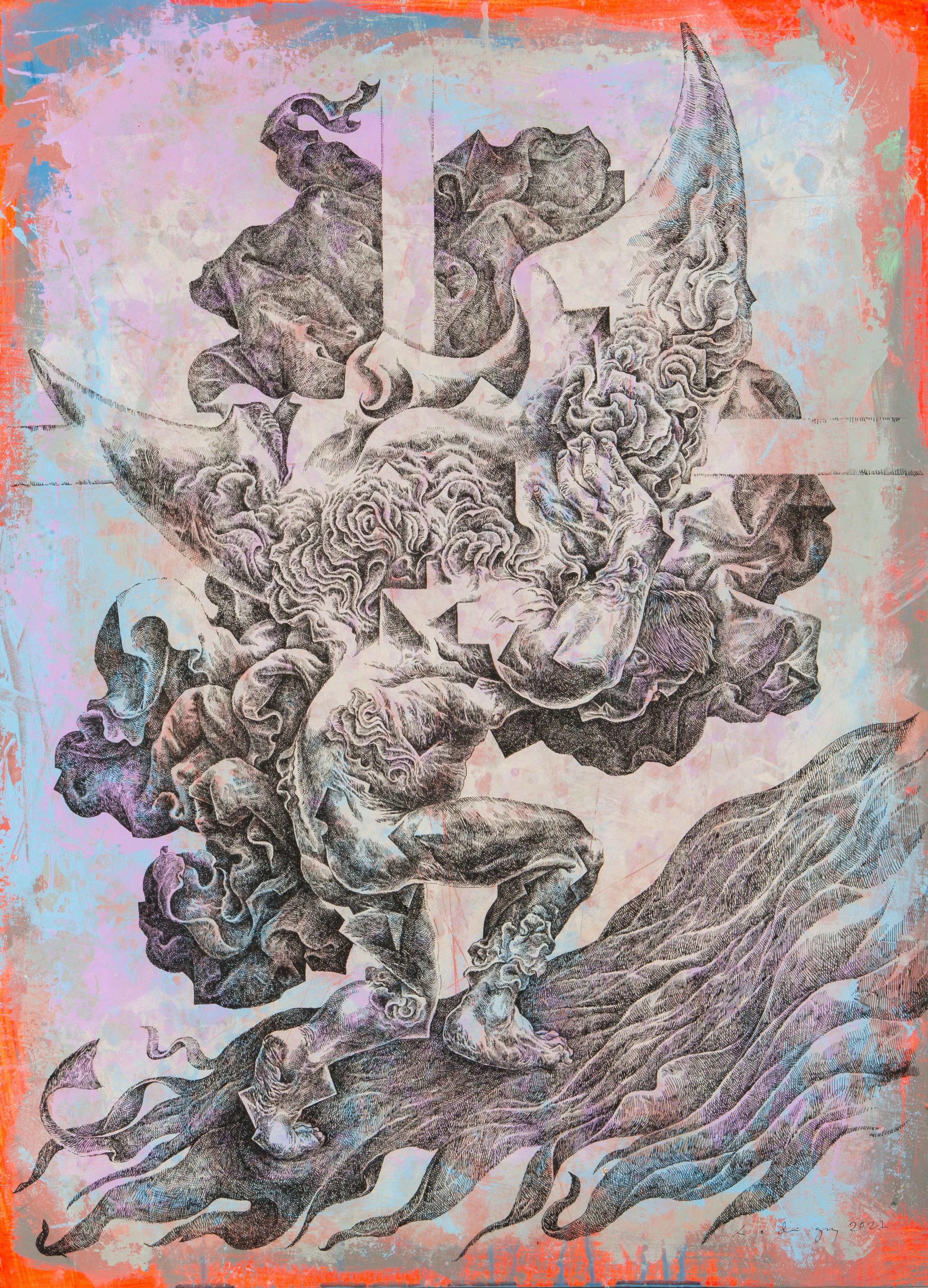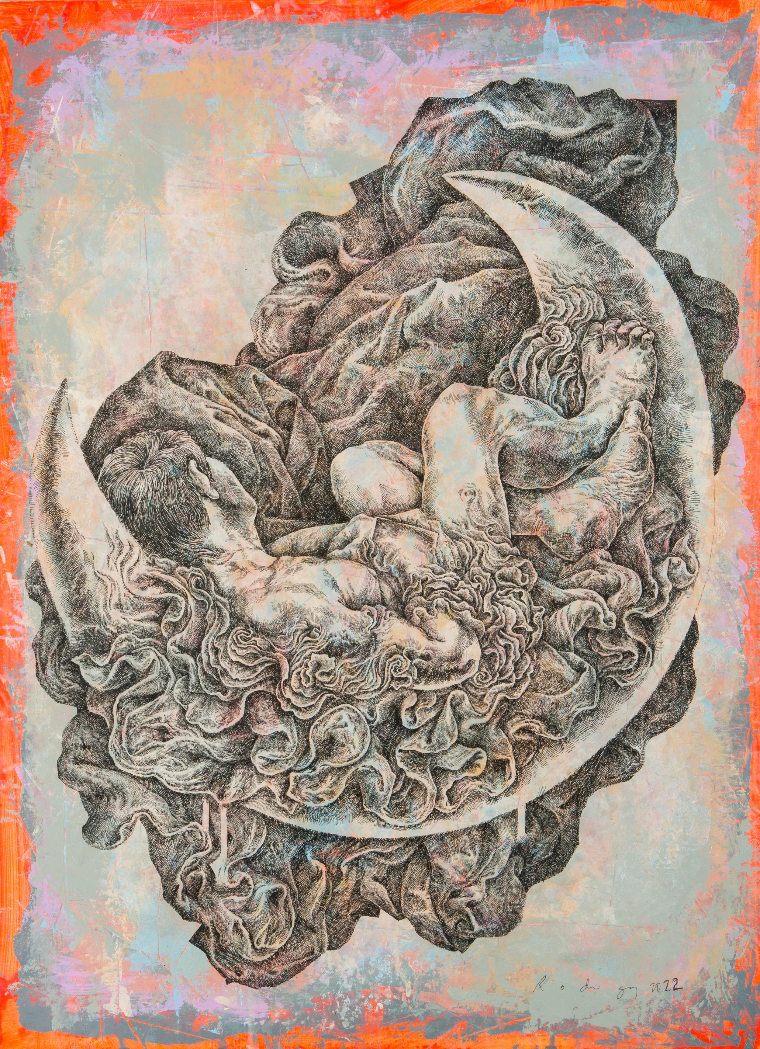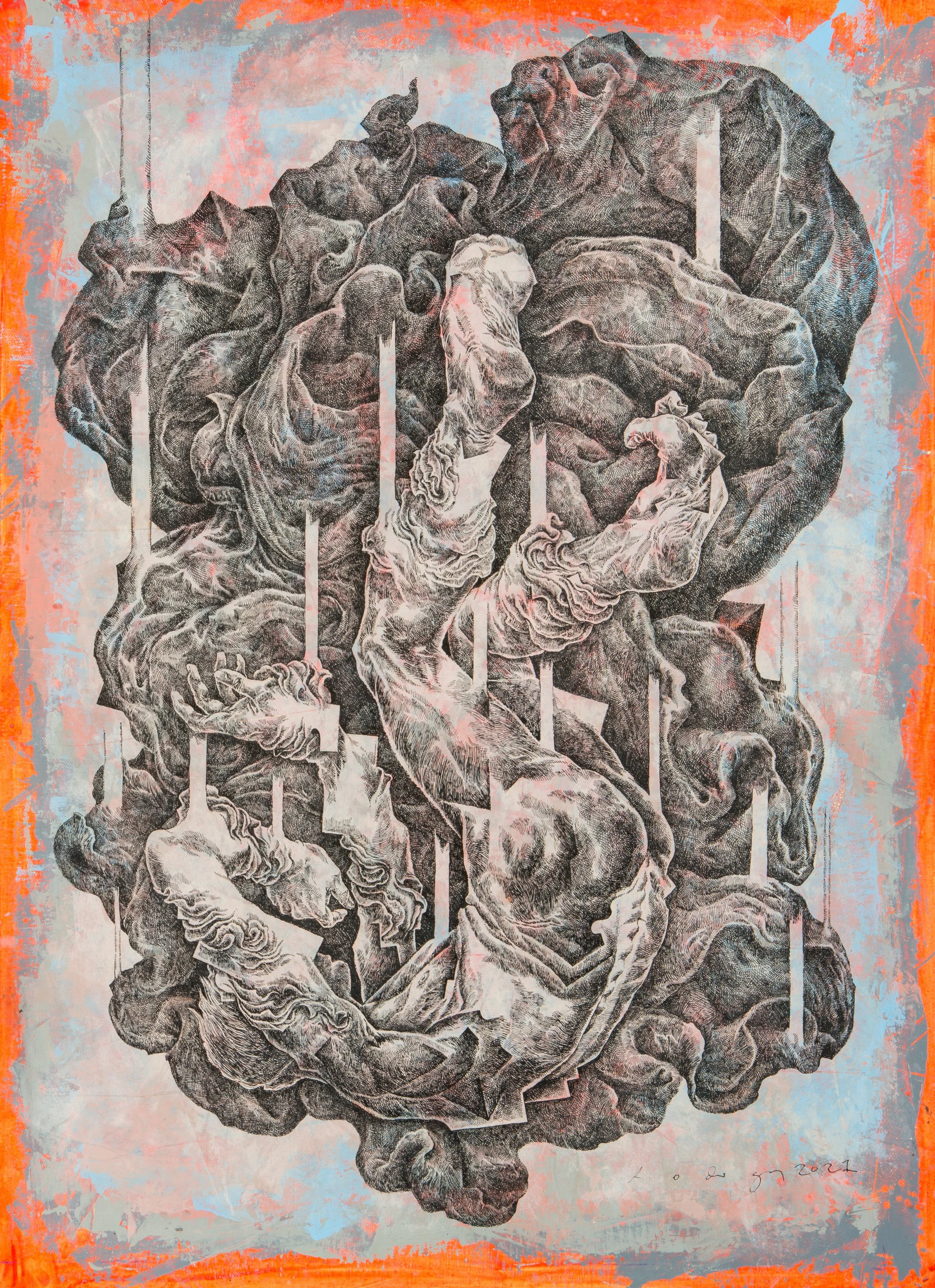 Scene 14 / Pen and ink, and acrylic on canvas / 30 x 20 in