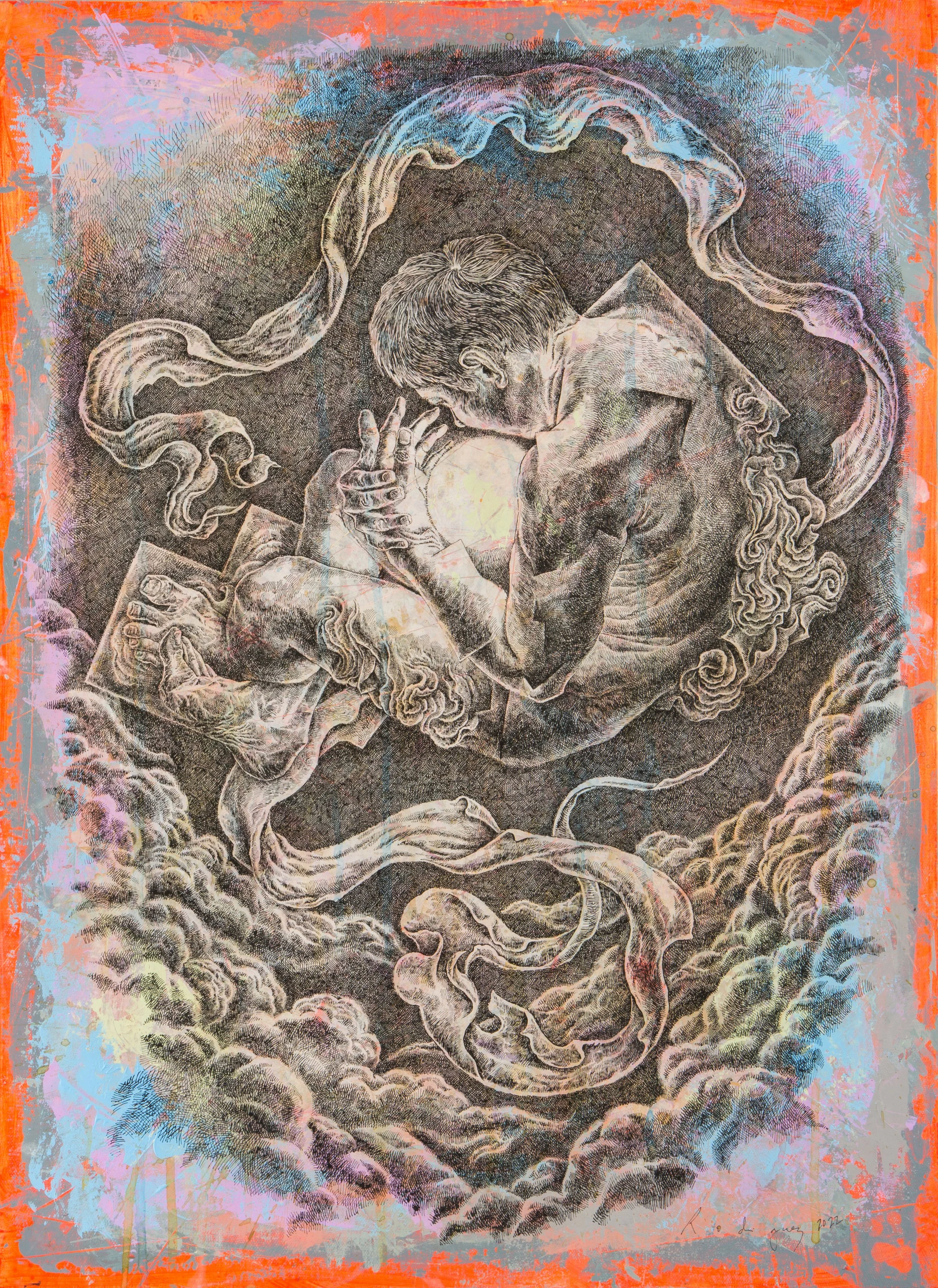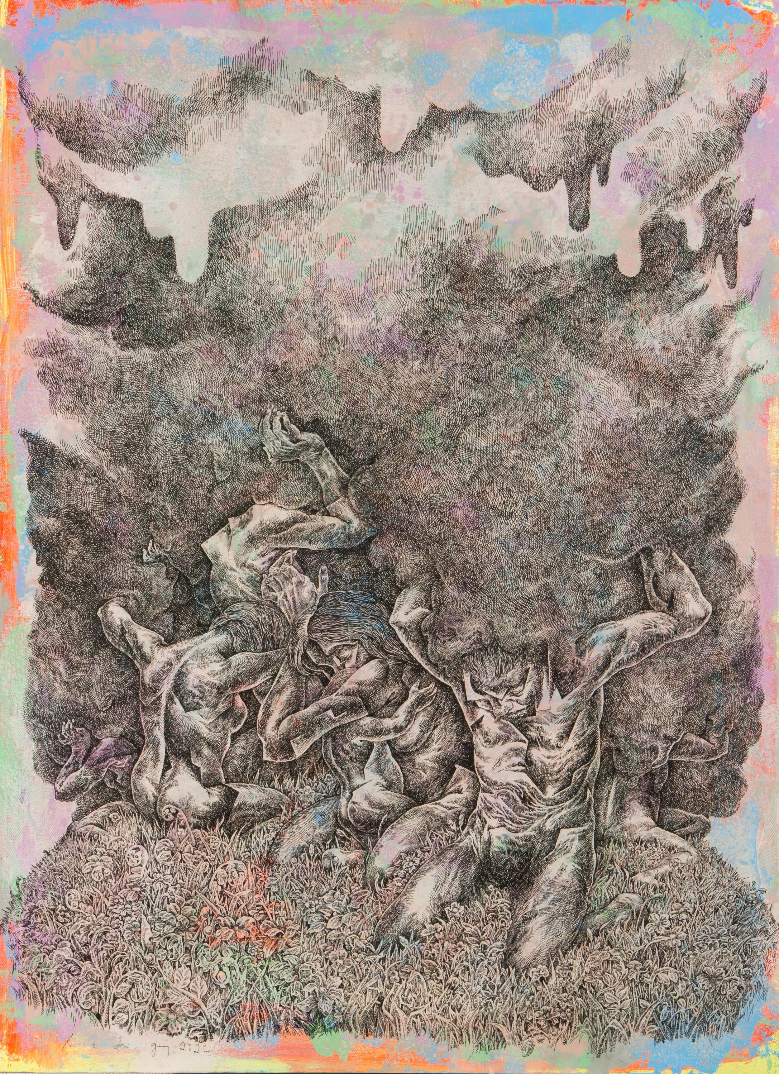 Scene 17 / Pen and ink, and acrylic on canvas / 30 x 20 in