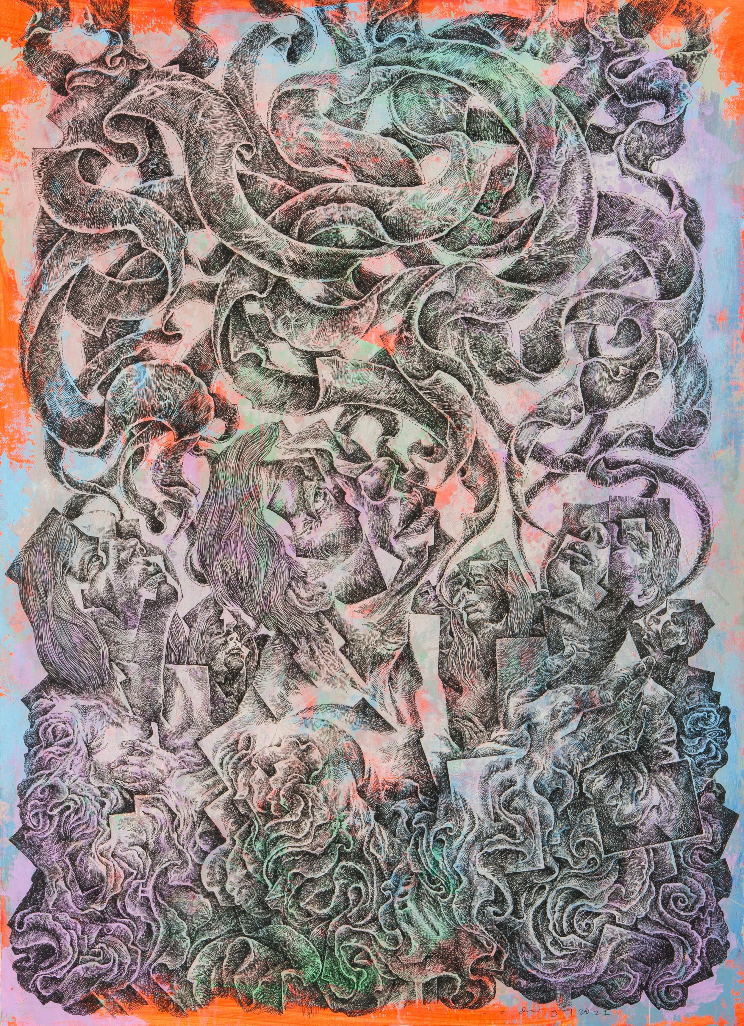 Scene 18 / Pen and ink, and acrylic on canvas / 30 x 20 in